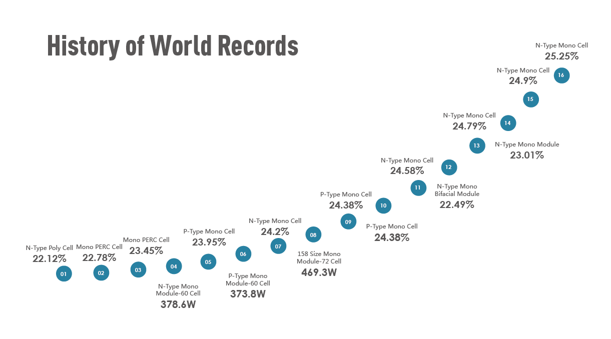 JinkoSolar continues to solidify its reputation in R&D and has made industry-leading iterations in silicon wafers, solar cells and solar modules over the years. Material upgrades integrated into the cell process and fabrication on a practical size of 267.4cm2 of high quality monocrystalline Czochralski (CZ) silicon substrates allowed the Company to achieve 25.25% cell efficiency. To achieve this extremely high solar cell efficiency using ultra-thin polysilicon, several advanced technologies have been implemented including JinkoSolar’s high quality N-type wafer, passivating contact technologies, advanced diffusion system, surface passivation, metallization of crystalline solar cells and other innovative technologies. This major breakthrough has not only increased the solar cell’s energy conversion efficiency, but has also paved the way for the Company’s mass production of N-type TopCon cells.